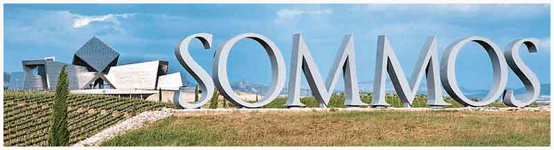 Bodega Sommos ha sido diseñada por el arquitecto Jesús Marino Pascual. Se trata de un proyecto enraizado en un terreno de viñedos del que emergen cubos de acero entrelazados, proporcionando a la bodega una imagen escultórica.